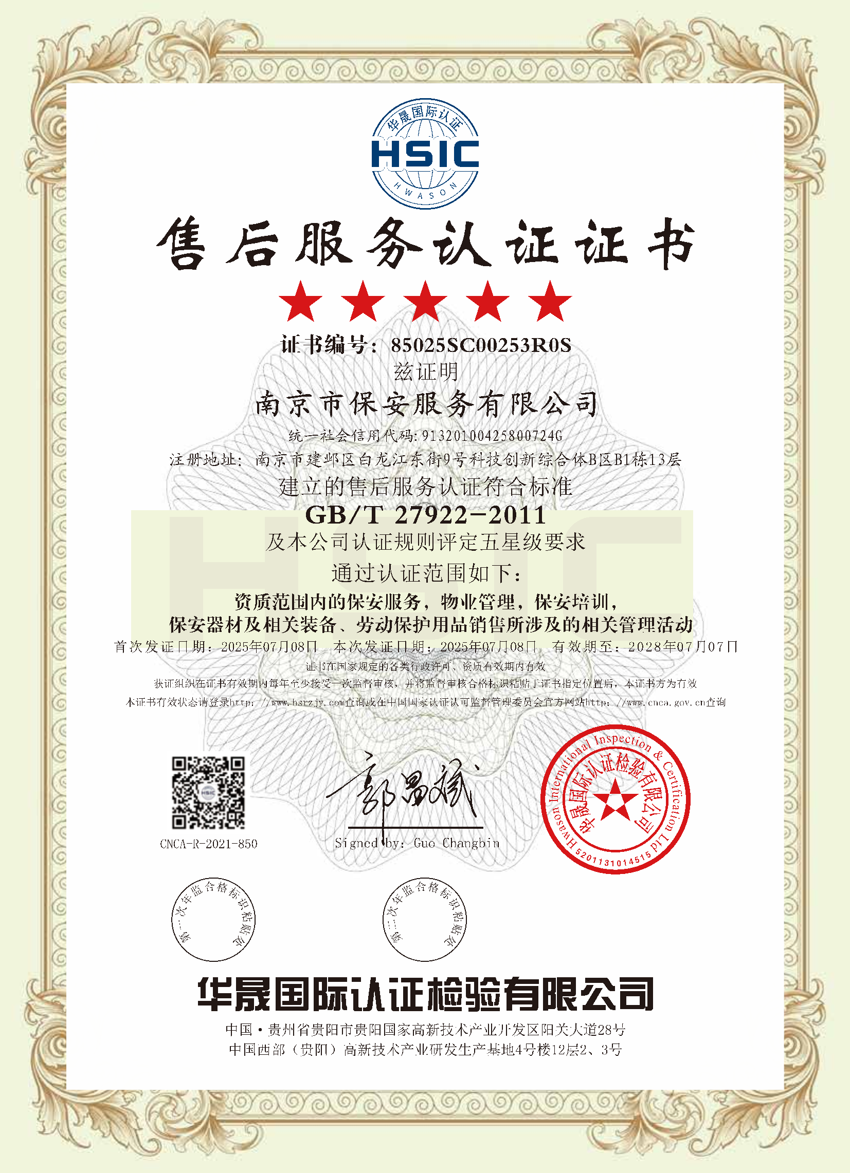 南京市保安服務有限公司(原南京市保安服務總公司)成立于1987年4月,是一個有著悠久安保經(jīng)營歷史和安保經(jīng)驗沉淀的大型國有保安企業(yè),現(xiàn)為中國保安協(xié)會常務理事單位,江蘇省保安協(xié)會常務理事單位,南京市保安協(xié)會副會長單位,江蘇省一級保安服務公司。