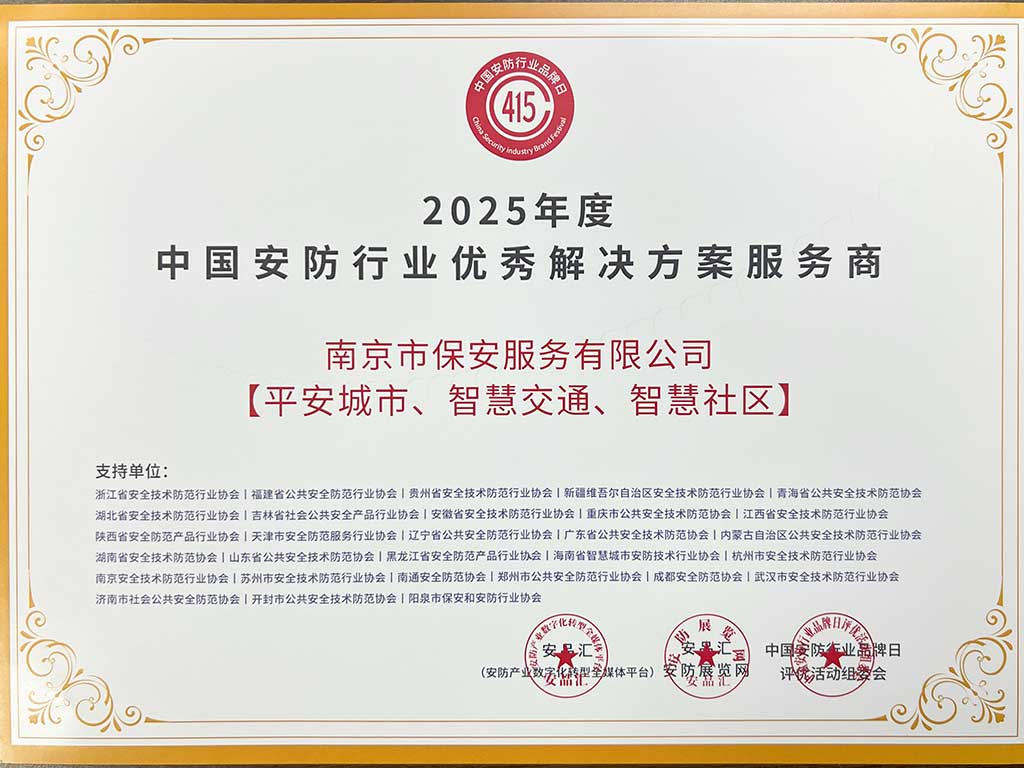 南京市保安服務有限公司(原南京市保安服務總公司)成立于1987年4月,是一個有著悠久安保經(jīng)營歷史和安保經(jīng)驗沉淀的大型國有保安企業(yè),現(xiàn)為中國保安協(xié)會常務理事單位,江蘇省保安協(xié)會常務理事單位,南京市保安協(xié)會副會長單位,江蘇省一級保安服務公司。